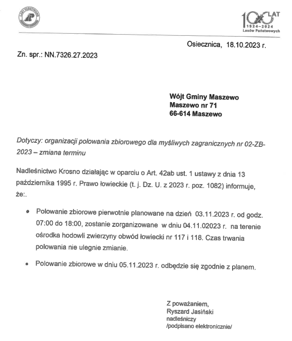 Zawiadomienie o zmianie terminu polowania zbiorowego
