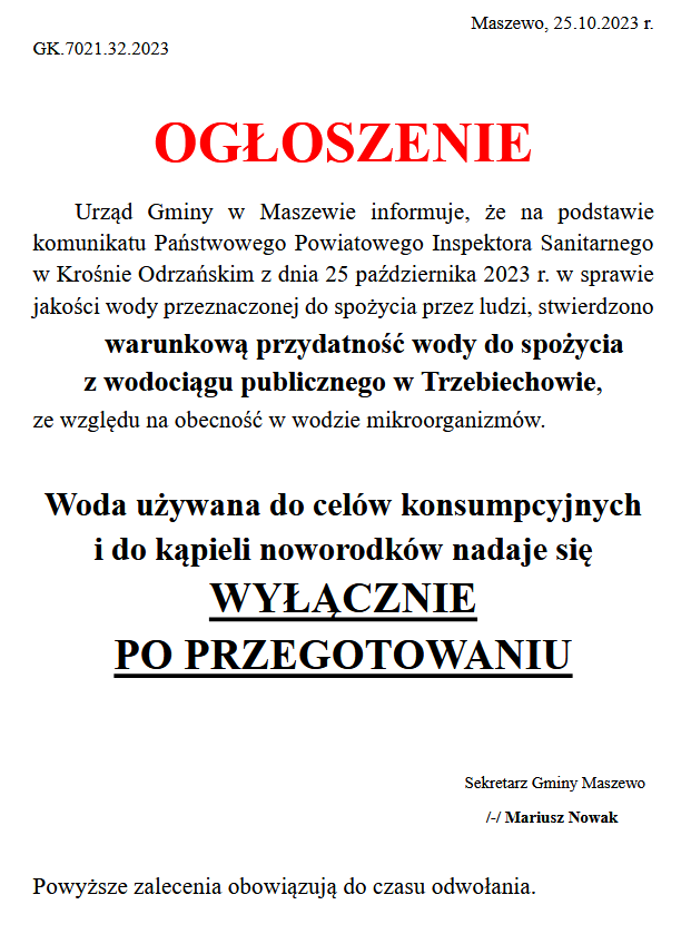 Woda z wodociągu publicznego w TRZEBIECHOWIE zdatna do spożycia PO PRZEGOTOWANIU