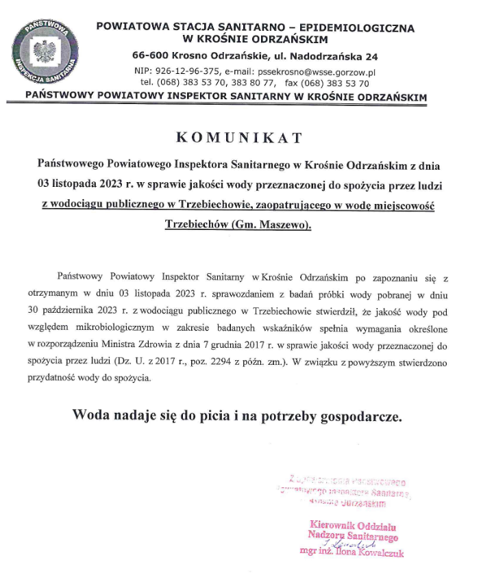 Woda z wodociągu publicznego w TRZEBIECHOWIE zdatna do spożycia przez ludziArchiwum