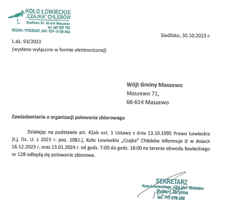 Informacja o planowanych polowaniach zbiorowych w dniach 16.12.2023r. i 13.01.2024r.