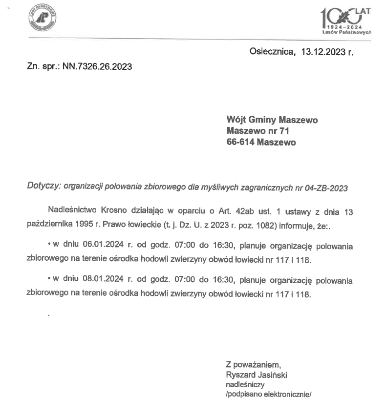 Zawiadomienie o organizacji polowania zbiorowego w dniach 06.01.2024 r. i 08.01.2024 r.