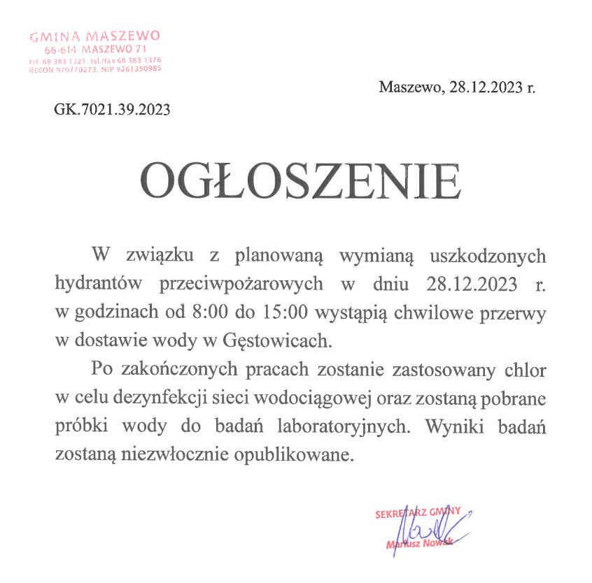 Komunikat - wymiana w dniu 28.12.2023 r. niesprawnych hydrantów w GęstowicachArchiwum