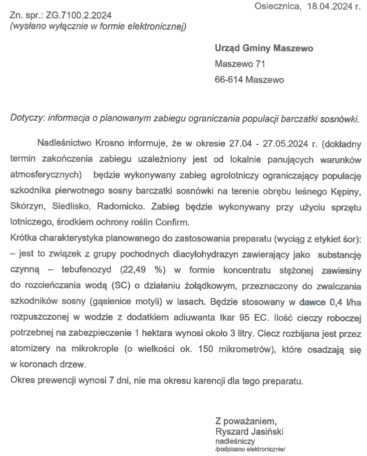 Informacja o planowanym zabiegu agrolotniczym 27.04-27.05.2024 r. - obręb leśny Kępiny, Skórzyn, Siedlisko, Radomicko